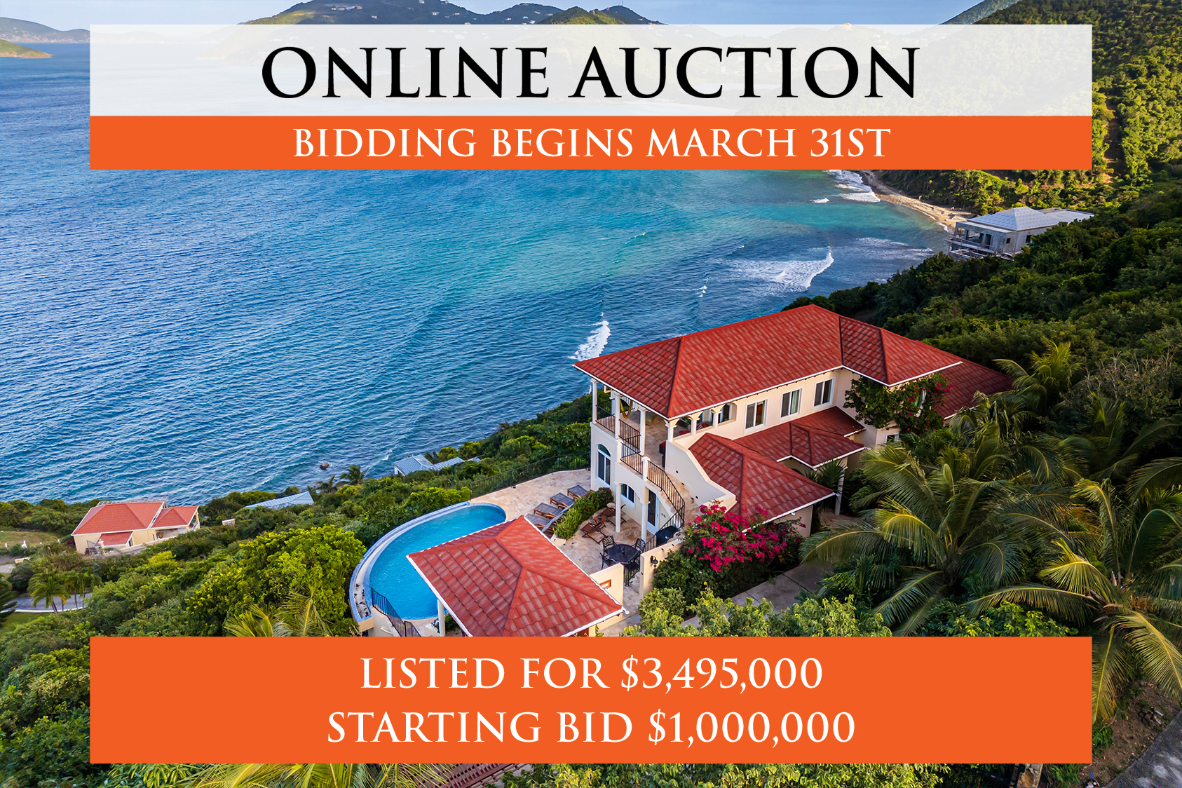 AUCTION – Seller offering property via online auction. Bid online beginning Monday, March 31st with a starting bid of $1,000,000, currently listed at $3.495M. Preview weekend begins Friday, March 28th.