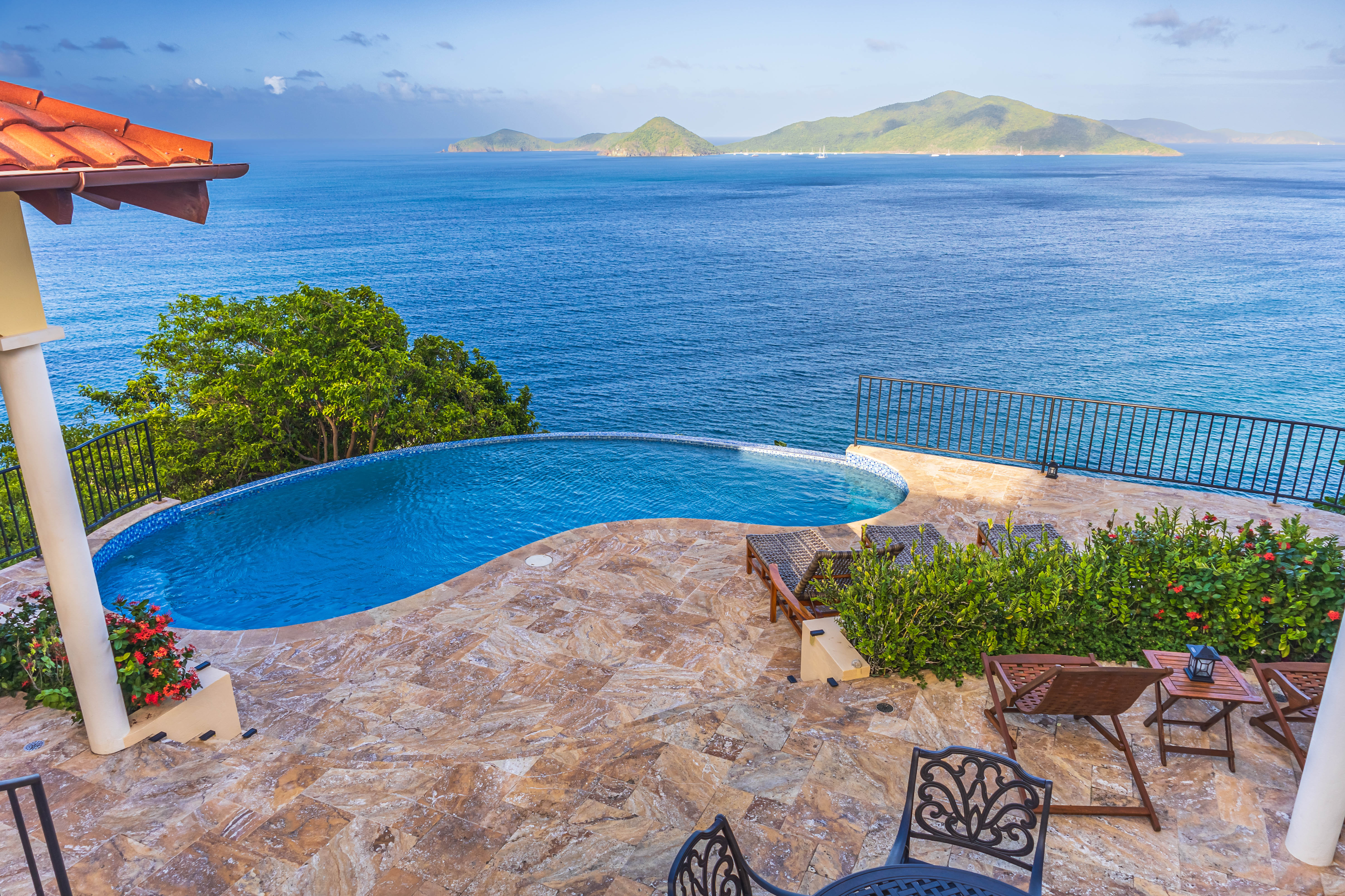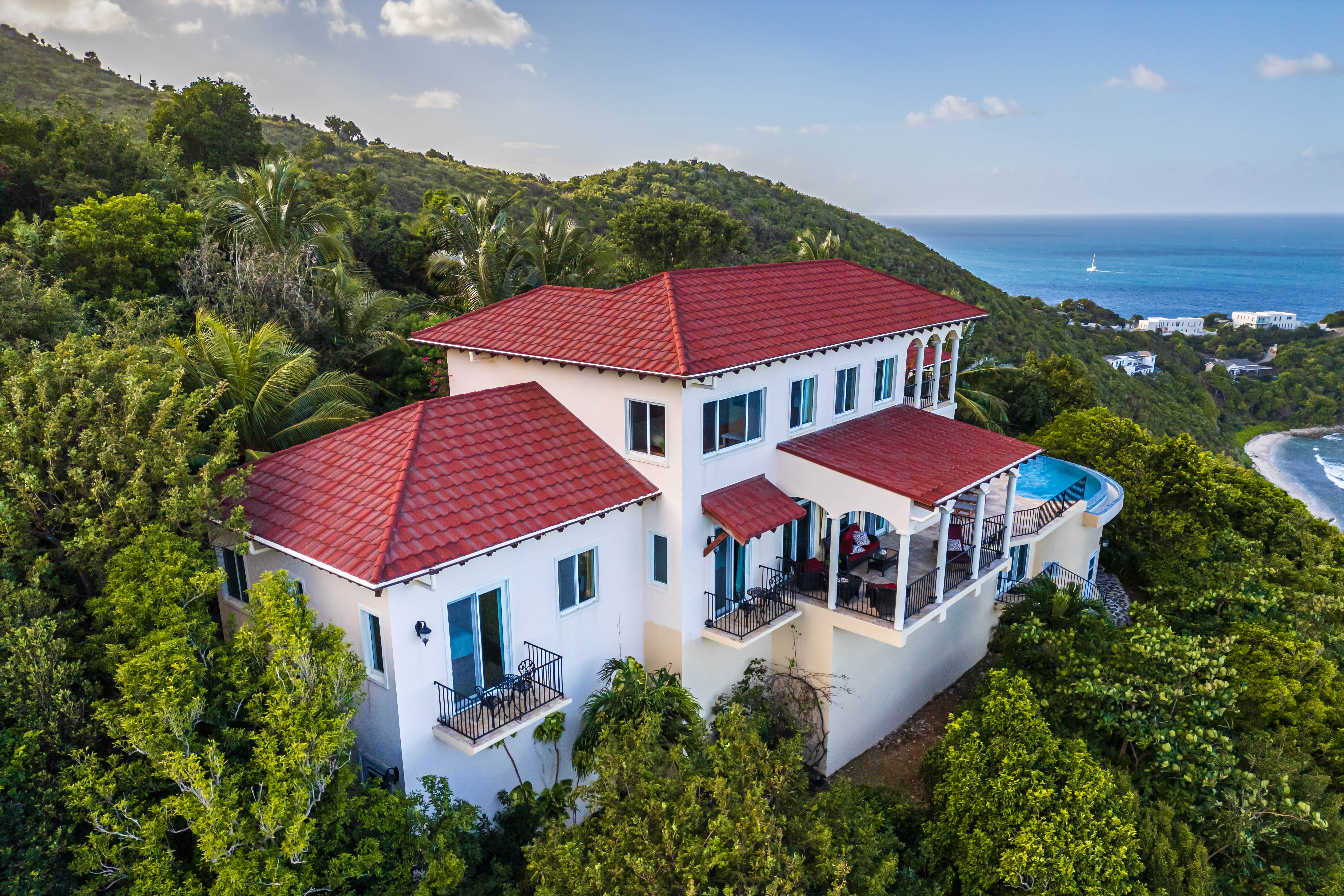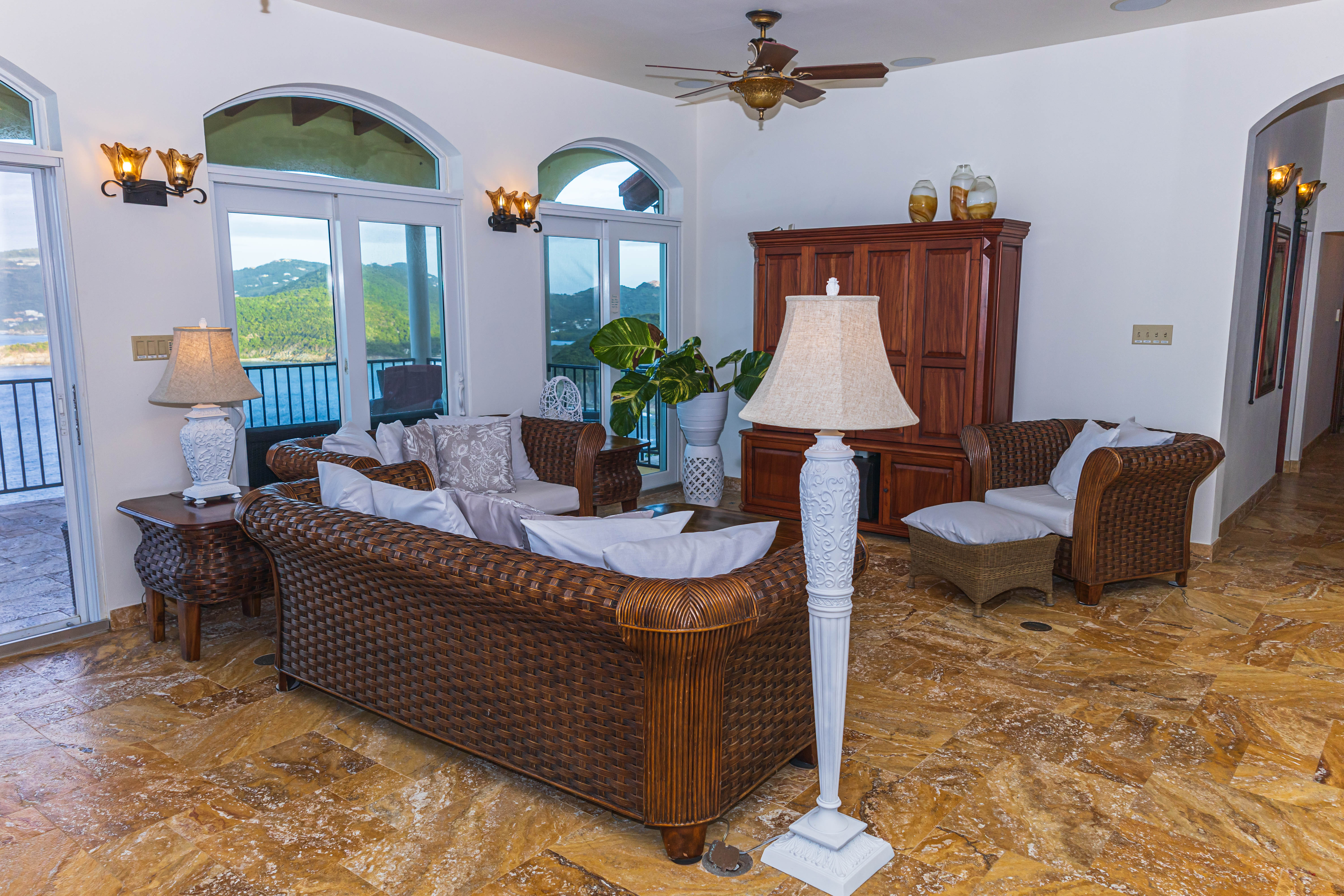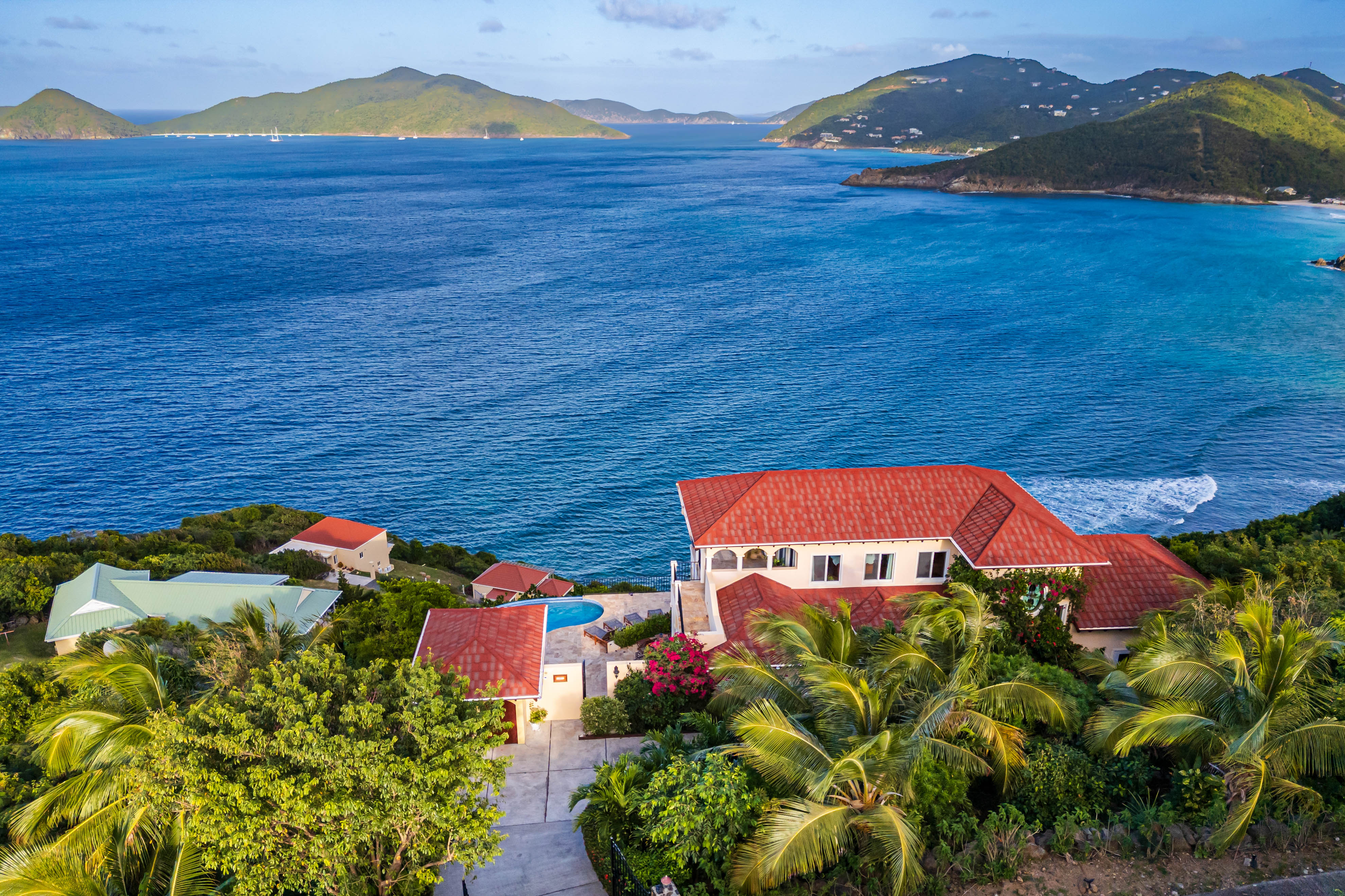 True to its tagline, “A View to Remember,” the AnaCapri Estate combines exceptional craftsmanship, breathtaking surroundings of mature floral gardens, and luxurious comforts to create an extraordinary retreat. Offering 4 bedrooms, 4 full bathrooms, and 2 half baths, the estate is sold fully furnished. The spacious living room opens to a covered patio with awe-inspiring vistas, while the adjoining kitchen and dining areas boast high-end finishes, artistic ceiling details, and hand-blown Murano glass lighting. The home features three alfresco dining areas, a poolside gazebo, outdoor showers, and a heated infinity-edge pool overlooking views of Tortola, Guana Island, Great Camanoe, The Dogs, Virgin Gorda, and Anegada.