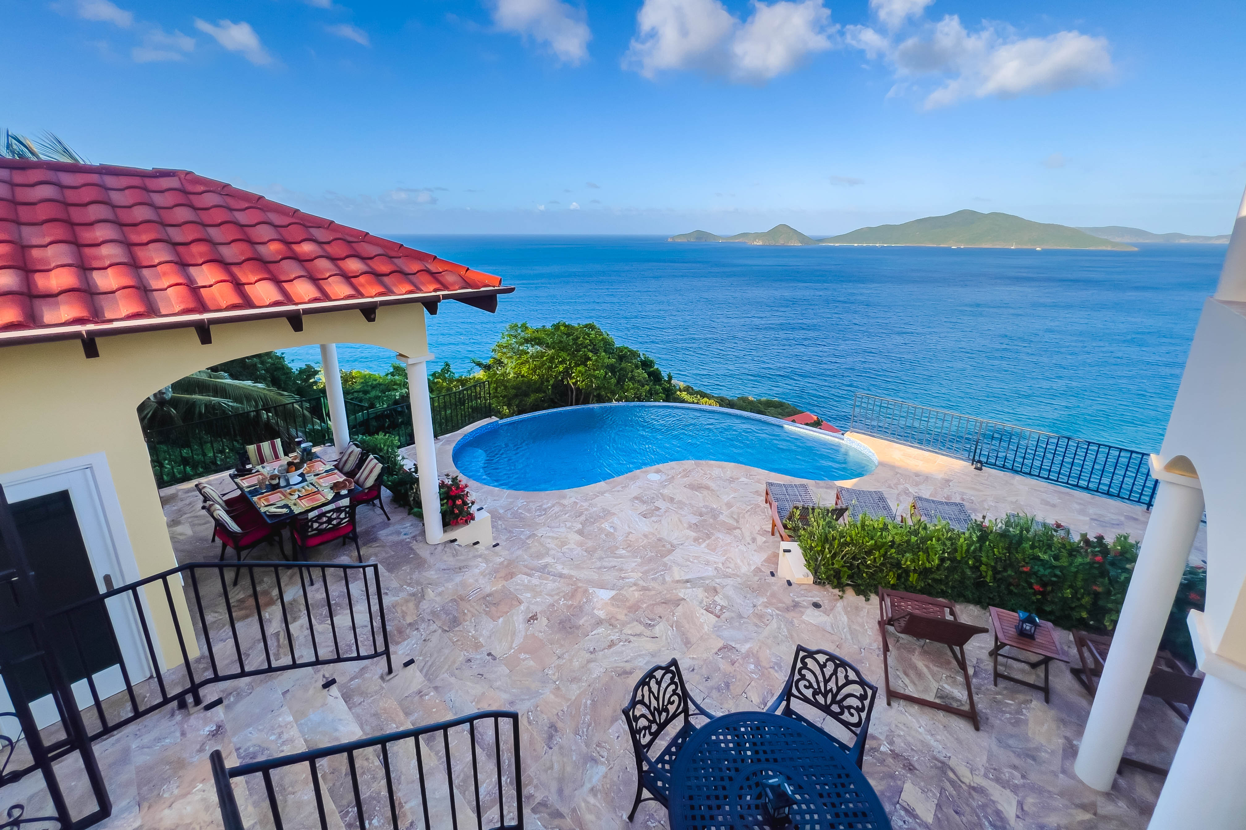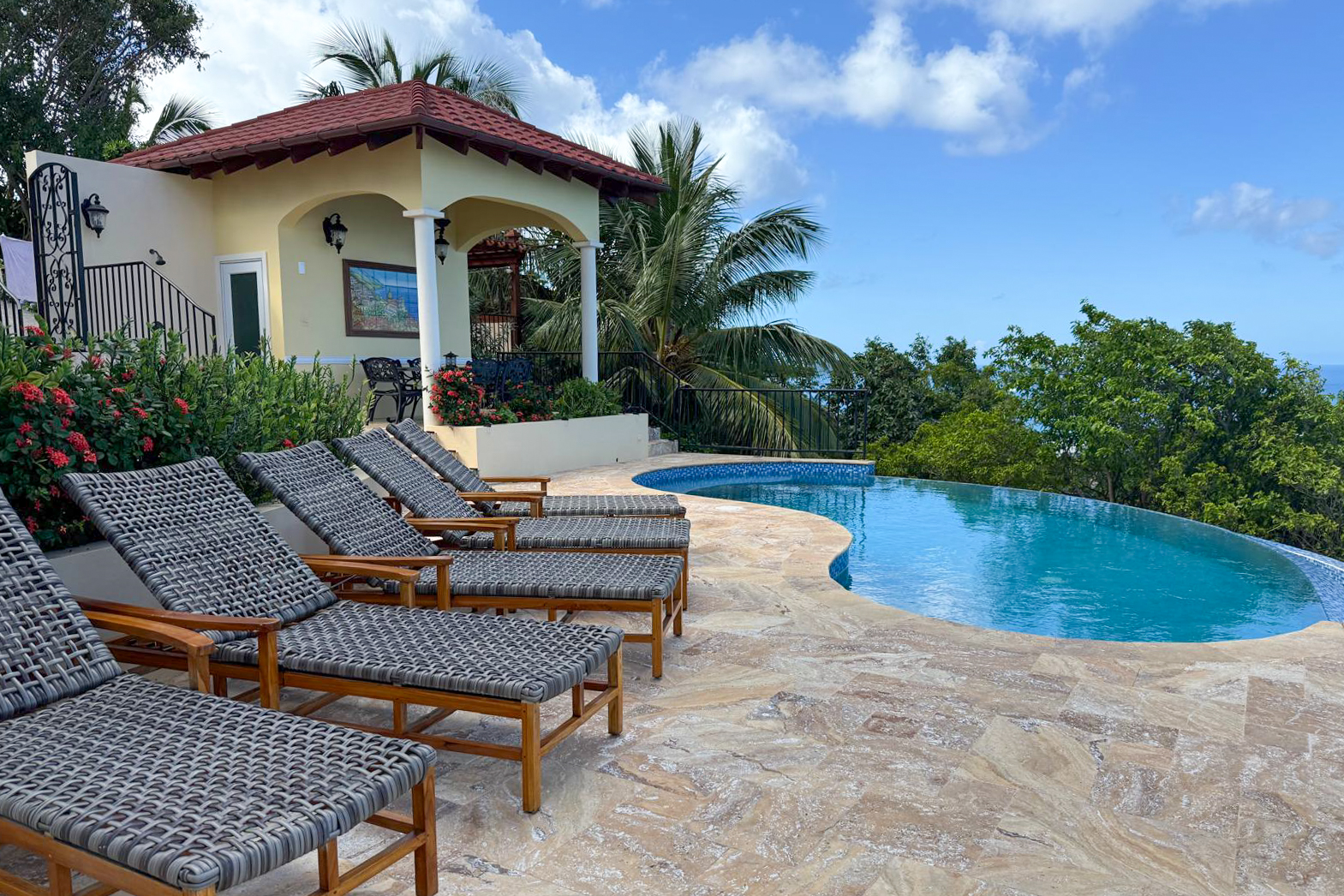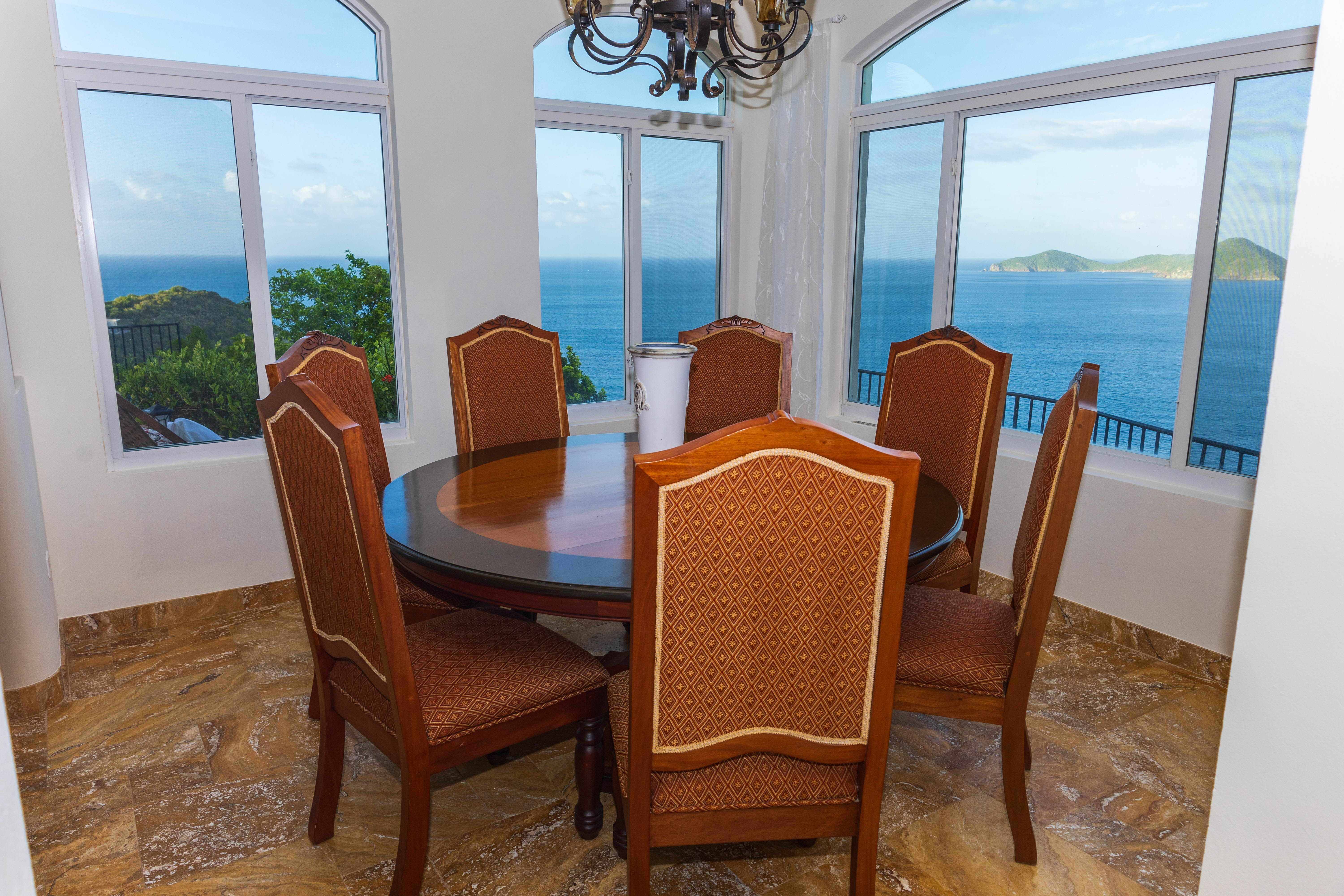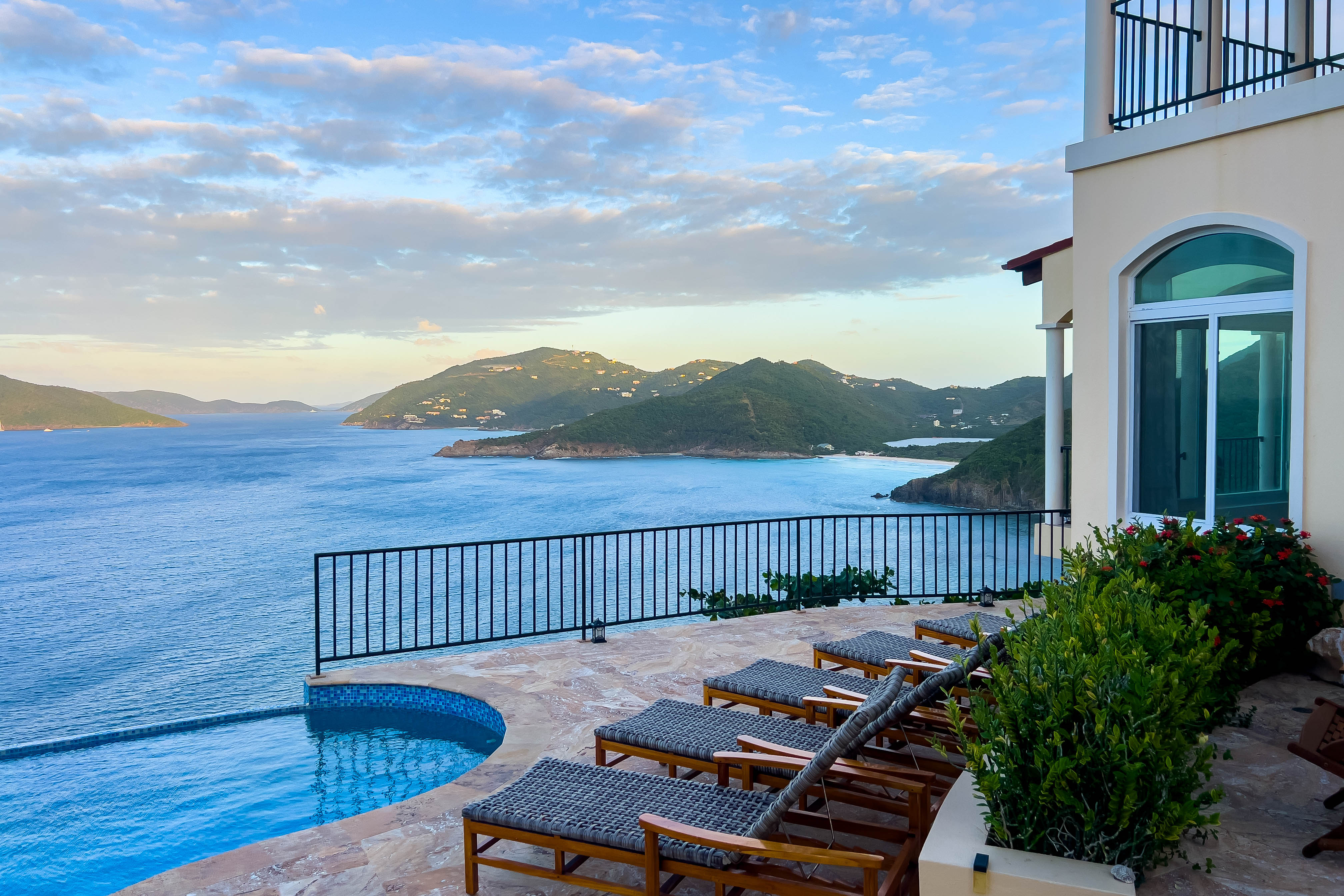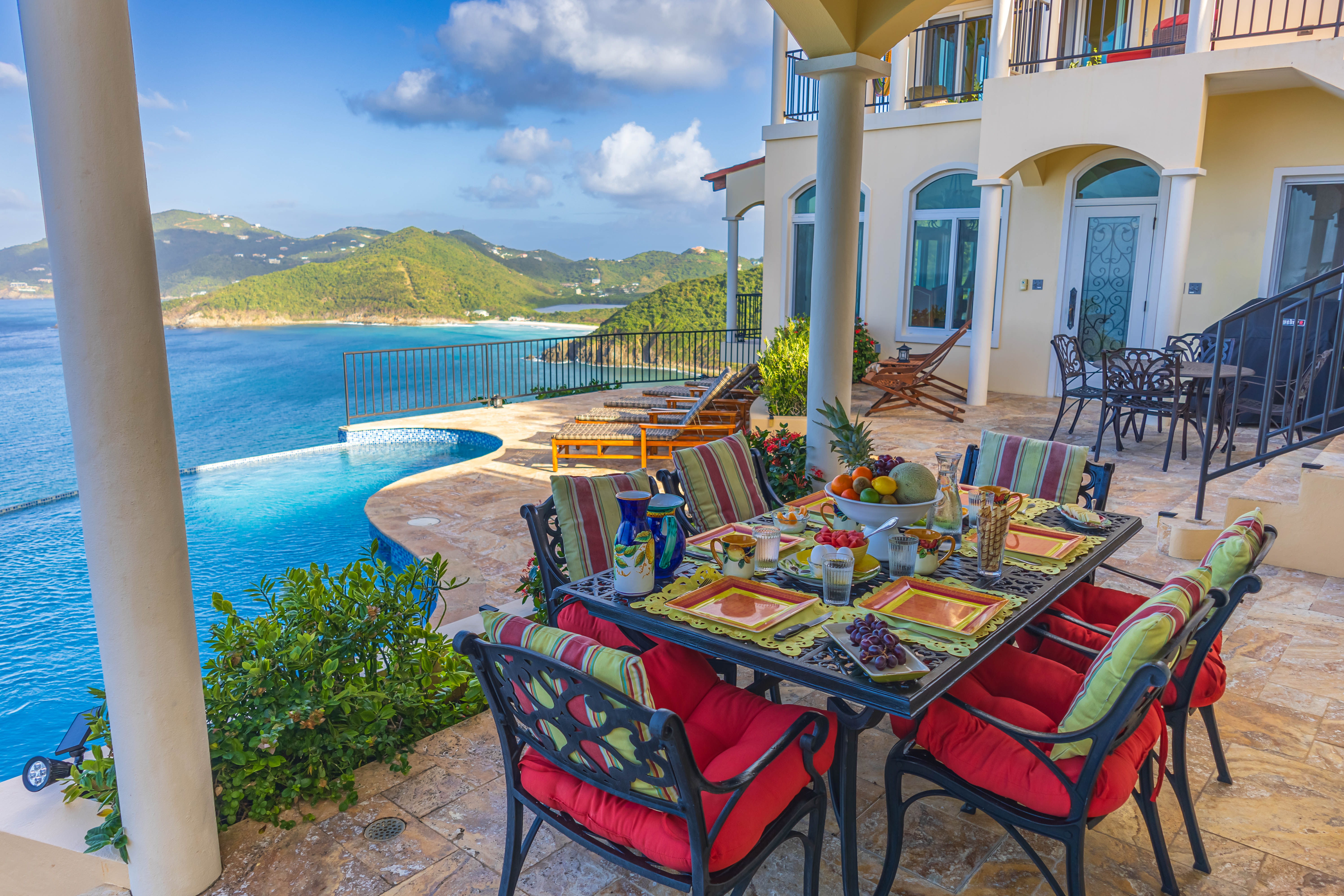 True to its tagline, “A View to Remember,” the AnaCapri Estate combines exceptional craftsmanship, breathtaking surroundings of mature floral gardens, and luxurious comforts to create an extraordinary retreat. Offering 4 bedrooms, 4 full bathrooms, and 2 half baths, the estate is sold fully furnished. The spacious living room opens to a covered patio with awe-inspiring vistas, while the adjoining kitchen and dining areas boast high-end finishes, artistic ceiling details, and hand-blown Murano glass lighting. The home features three alfresco dining areas, a poolside gazebo, outdoor showers, and a heated infinity-edge pool overlooking views of Tortola, Guana Island, Great Camanoe, The Dogs, Virgin Gorda, and Anegada.