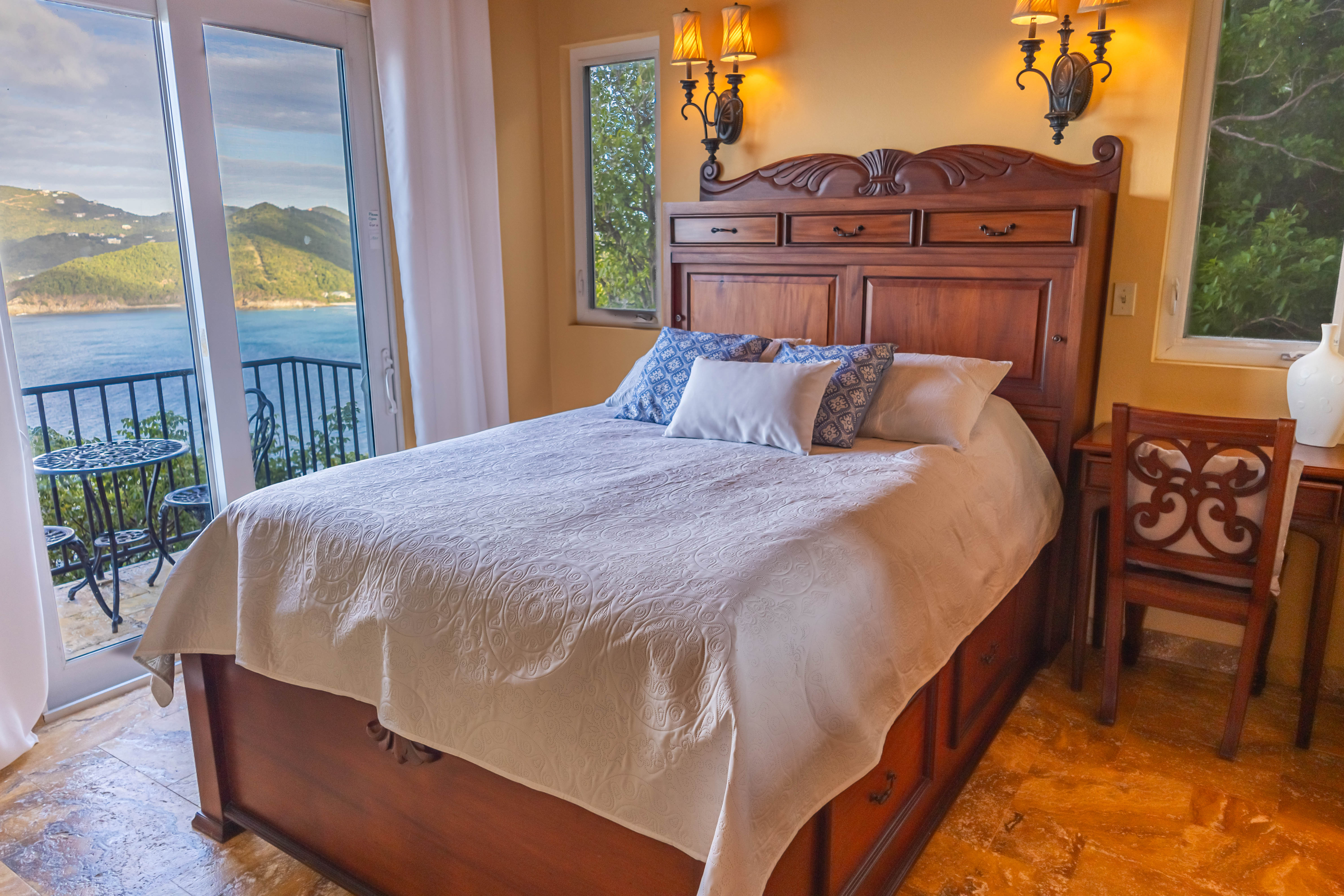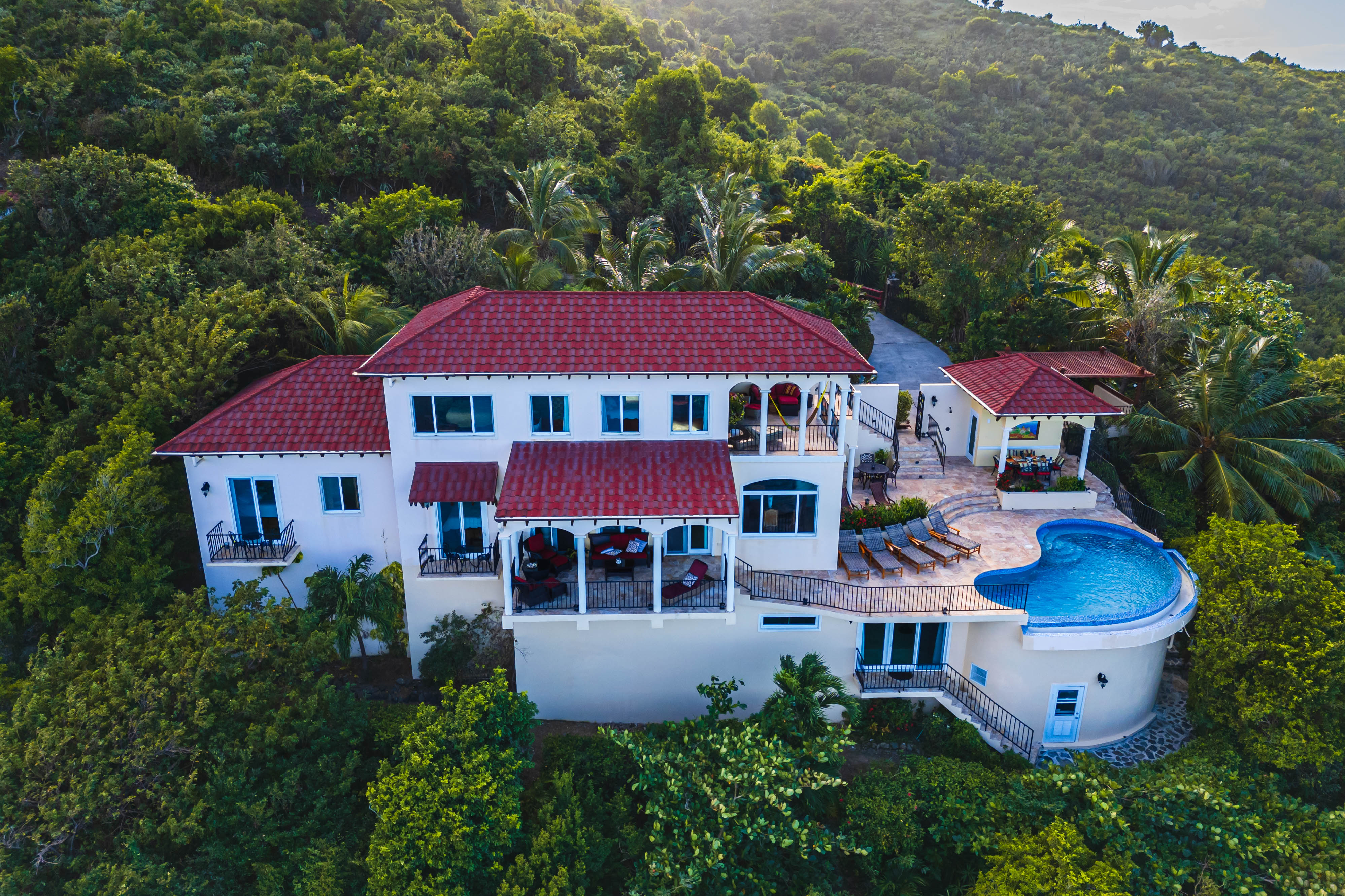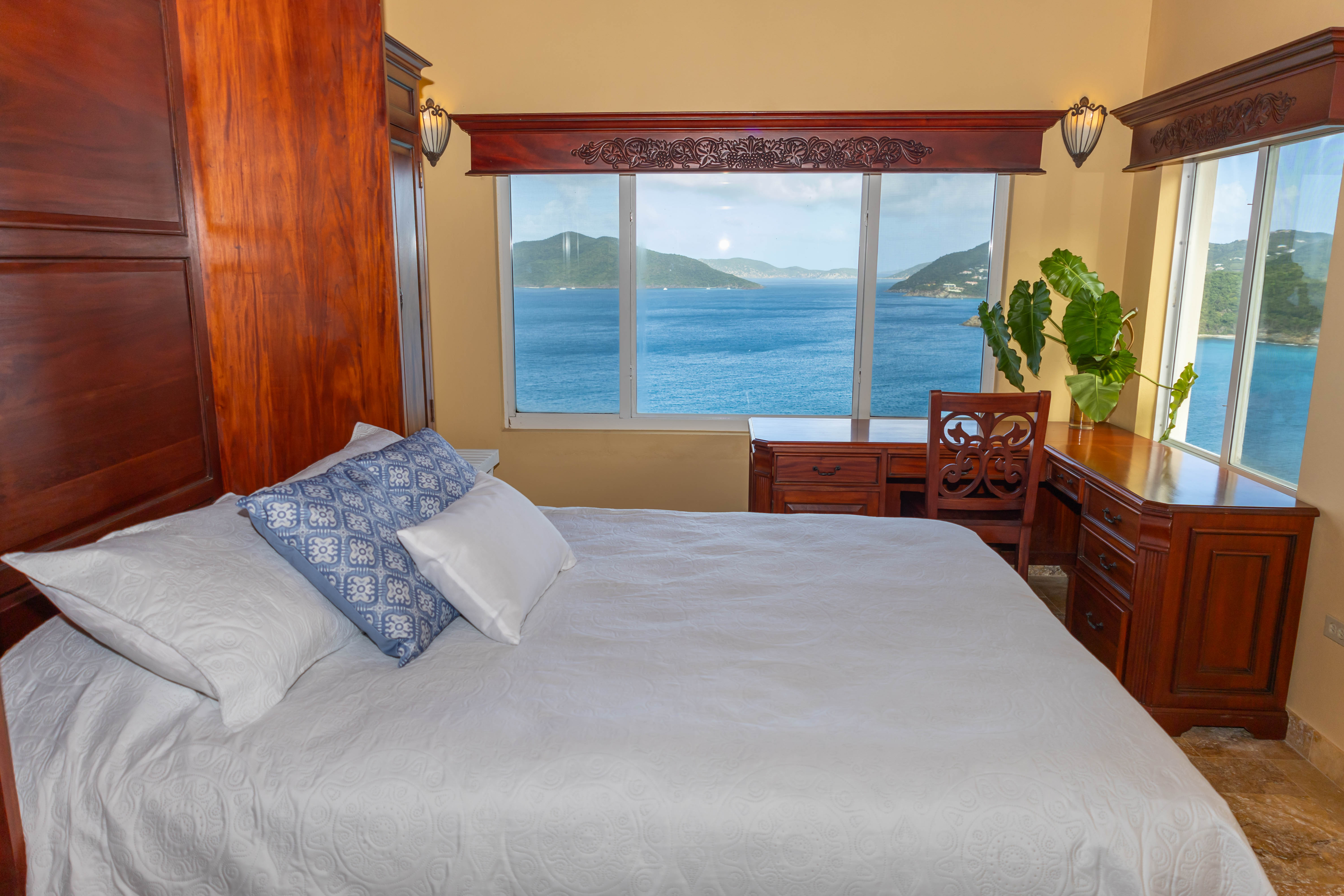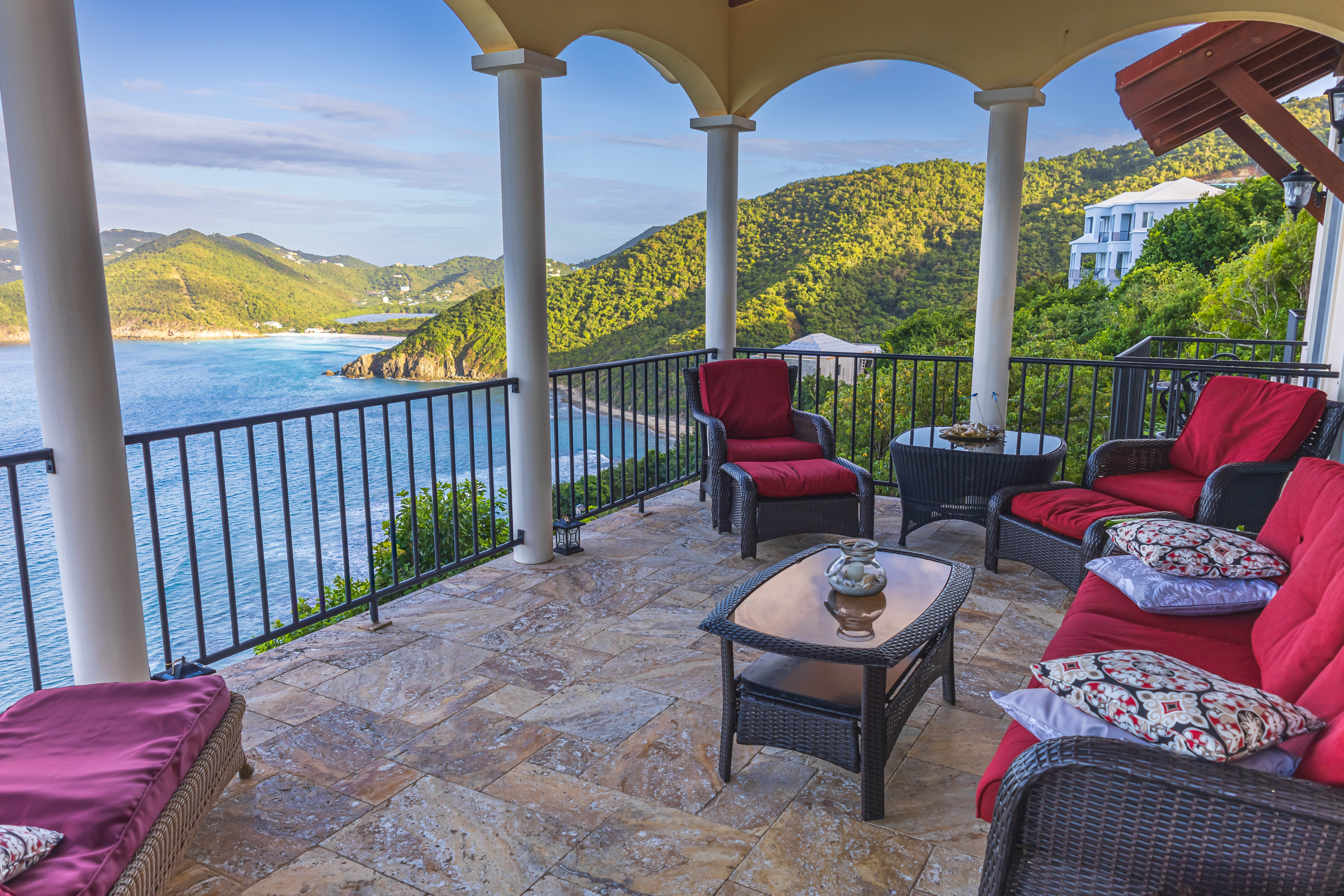True to its tagline, “A View to Remember,” the AnaCapri Estate combines exceptional craftsmanship, breathtaking surroundings of mature floral gardens, and luxurious comforts to create an extraordinary retreat. Offering 4 bedrooms, 4 full bathrooms, and 2 half baths, the estate is sold fully furnished. The spacious living room opens to a covered patio with awe-inspiring vistas, while the adjoining kitchen and dining areas boast high-end finishes, artistic ceiling details, and hand-blown Murano glass lighting. The home features three alfresco dining areas, a poolside gazebo, outdoor showers, and a heated infinity-edge pool overlooking views of Tortola, Guana Island, Great Camanoe, The Dogs, Virgin Gorda, and Anegada.