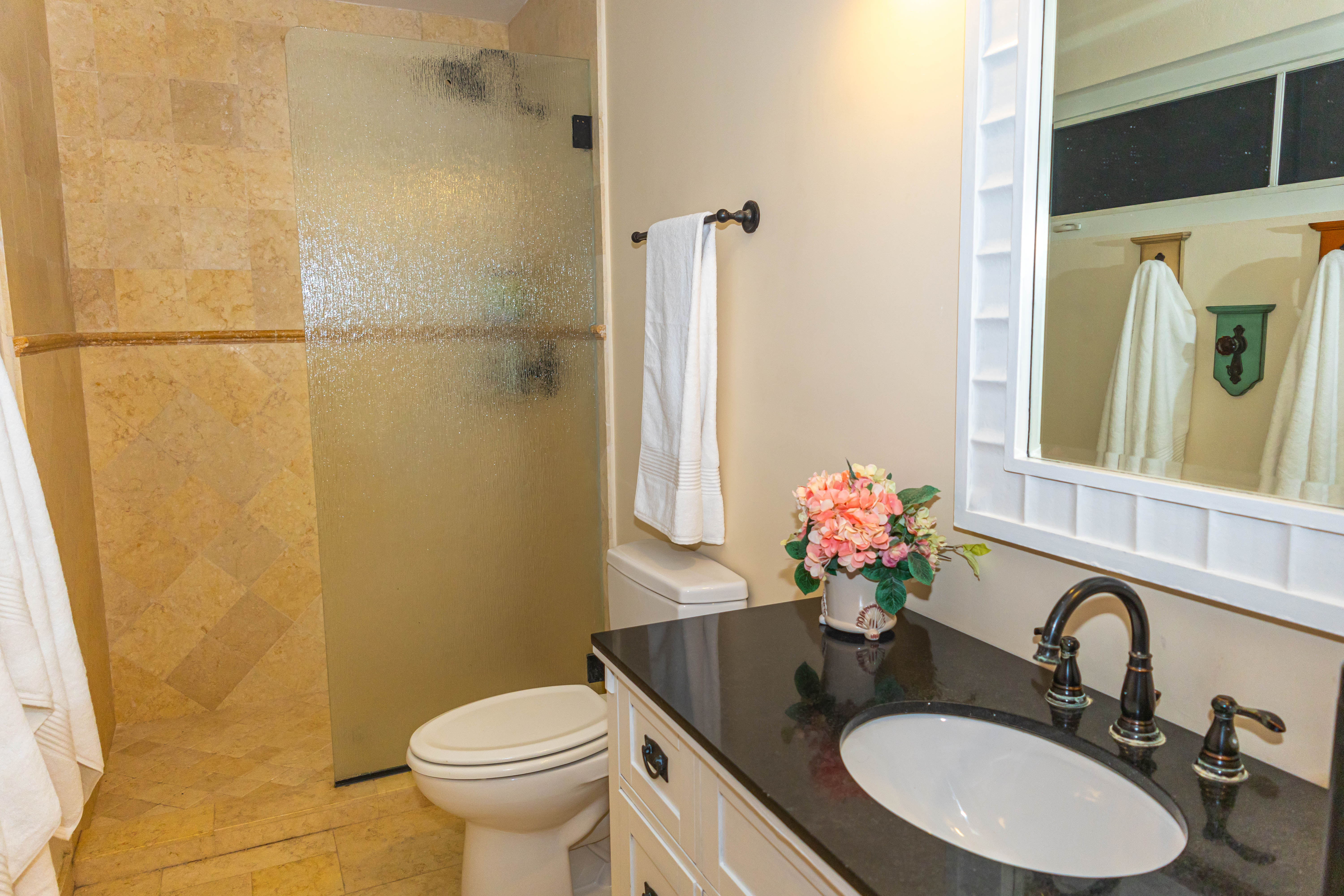 The main level includes two guest bedrooms with private balconies and ensuite bathrooms. The upper level is dedicated to the owner’s spa-inspired primary suite with a king-sized bed, balcony offering panoramic views, and an adjacent custom-designed office. A fully equipped guest suite on the lower level provides additional privacy.