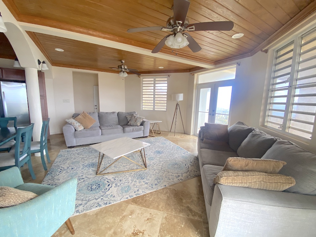 Beautifully finished 3 bed 3 bath apartment with spectacular views towards the Eastern Islands. Easy access to Road Town and to the ridge road. Spacious open plan kitchen/living area completely refurbished after Irma, opening out on to covered wrap around balcony.