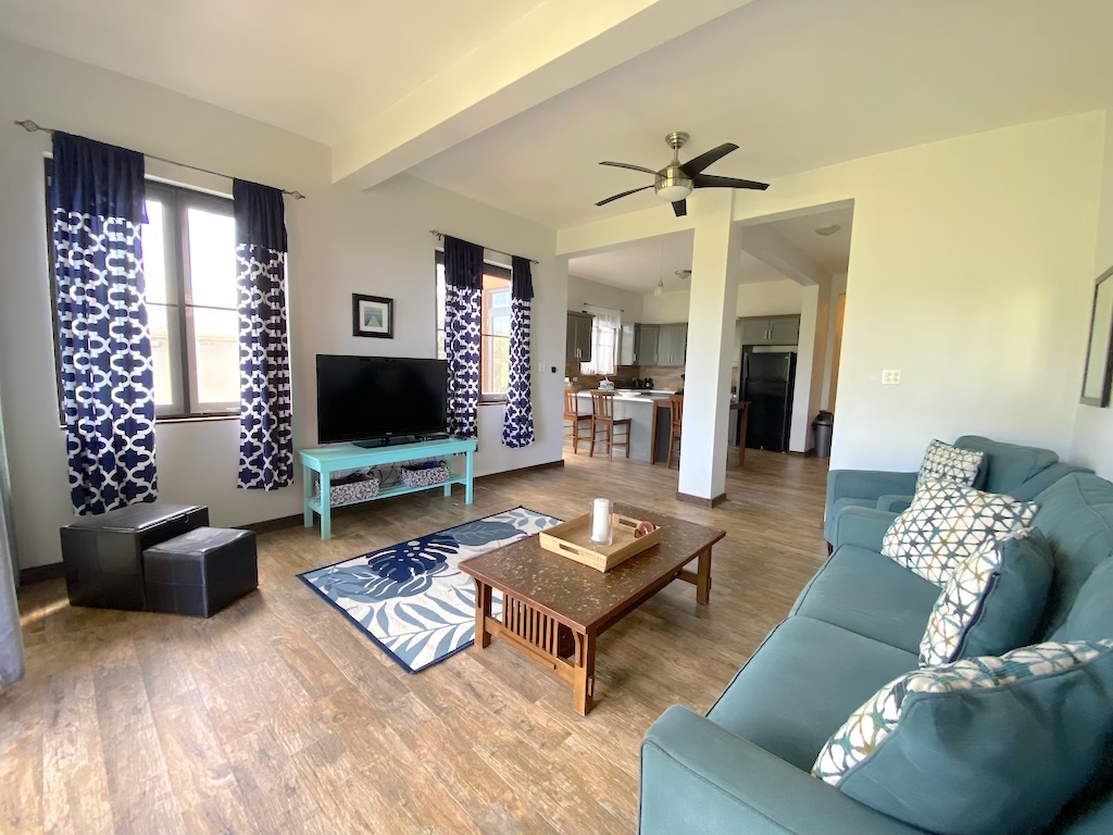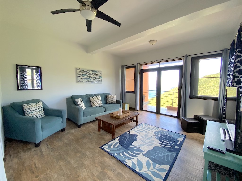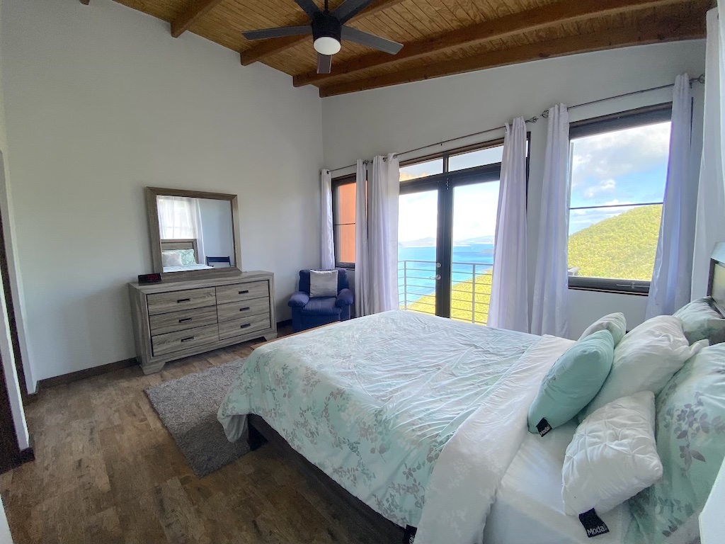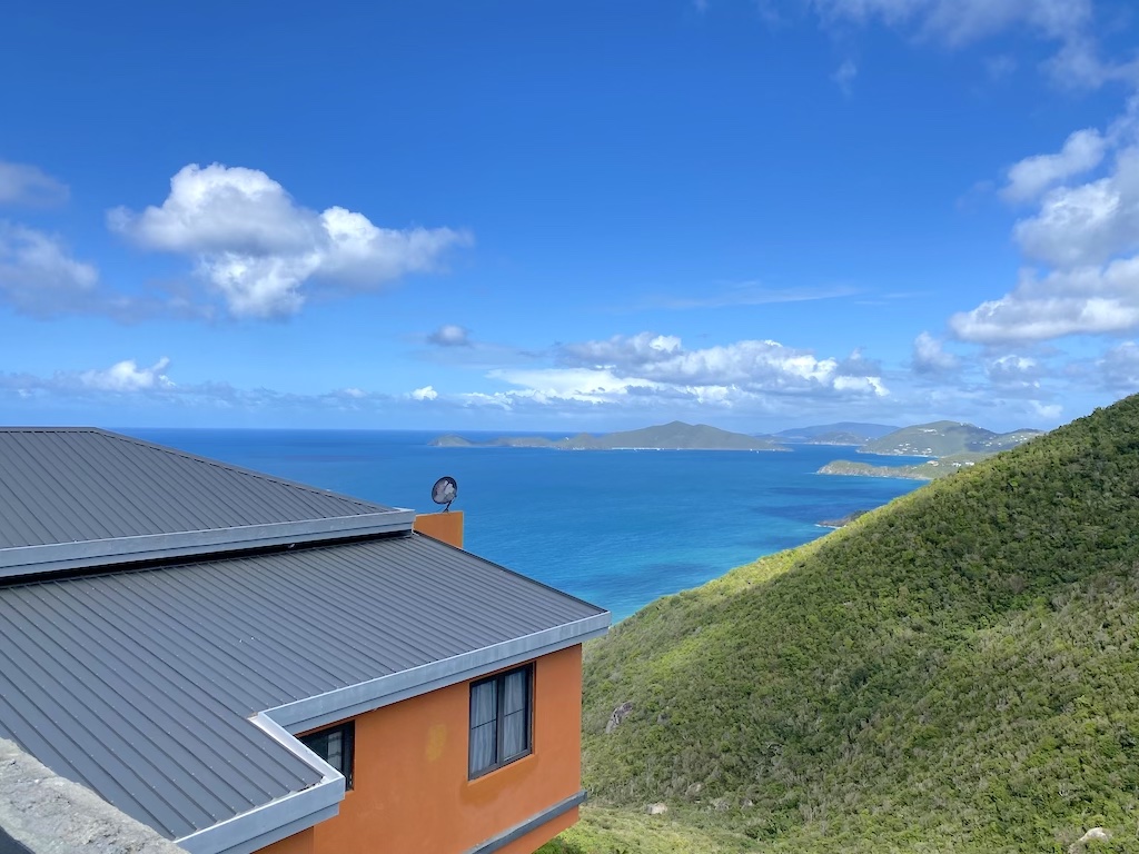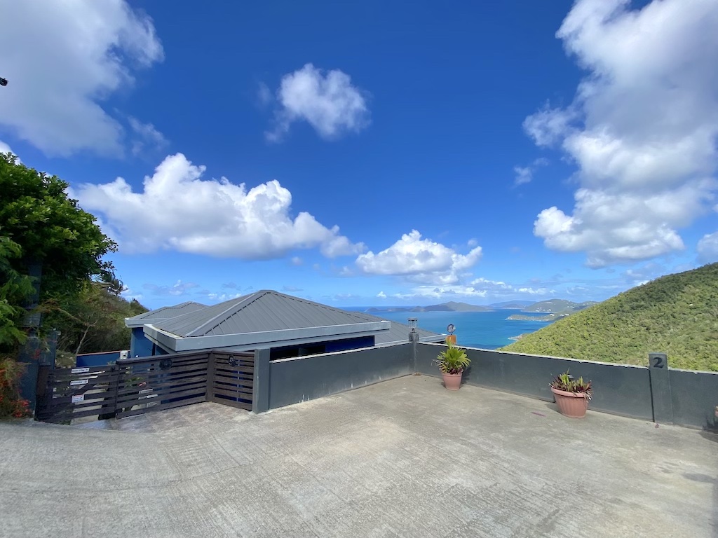 On the lower floor there is ample storage space along with a beautifully finished, modern open plan kitchen/living area. Views from all floors over tropical greenery and turquoise seas towards Guana Island, just a 10minute drive from Road Town. Private laundry, AC in bedrooms, concrete parking for one car.
