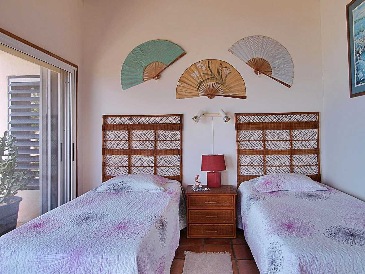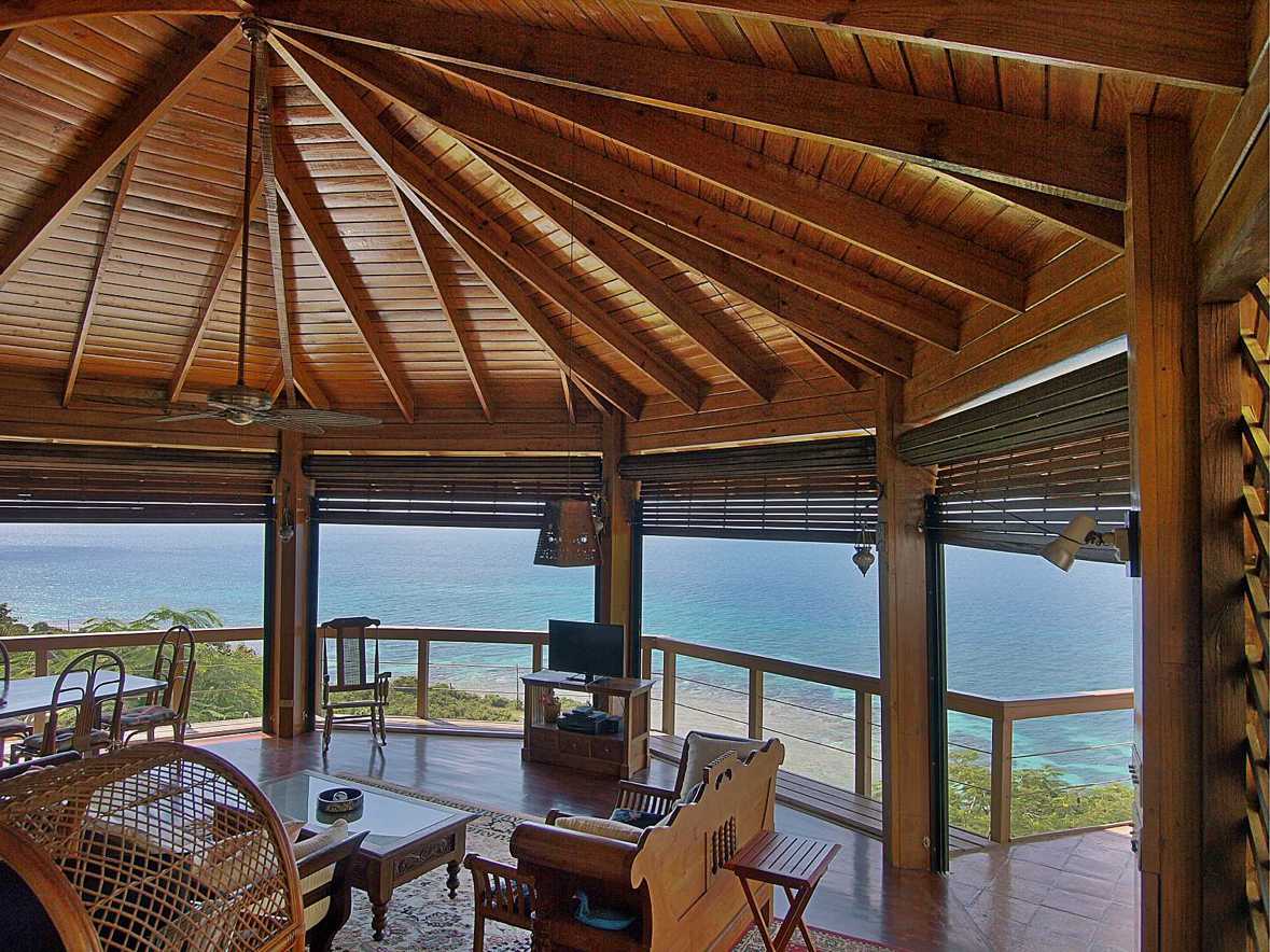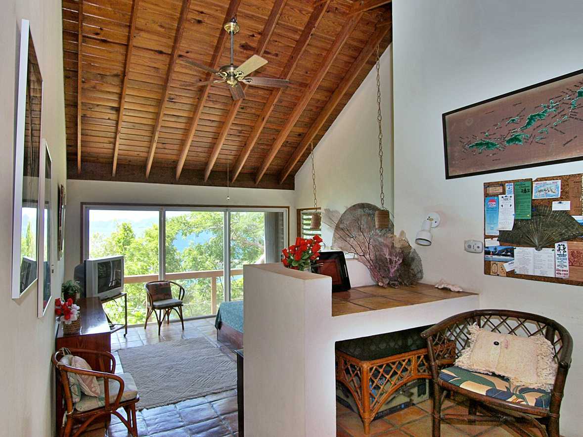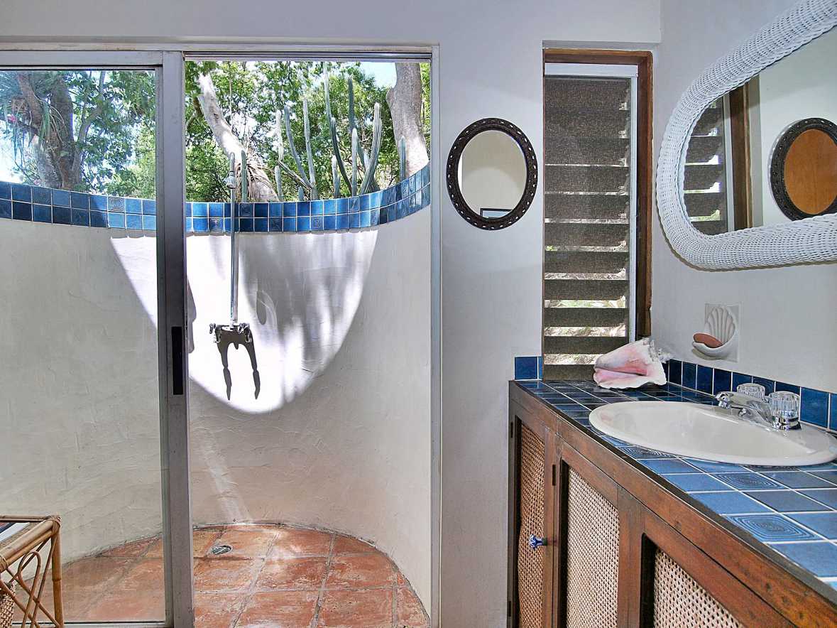 The top floor offers two bedrooms and two bathrooms, including an inviting outdoor shower that enhances the island-living experience.